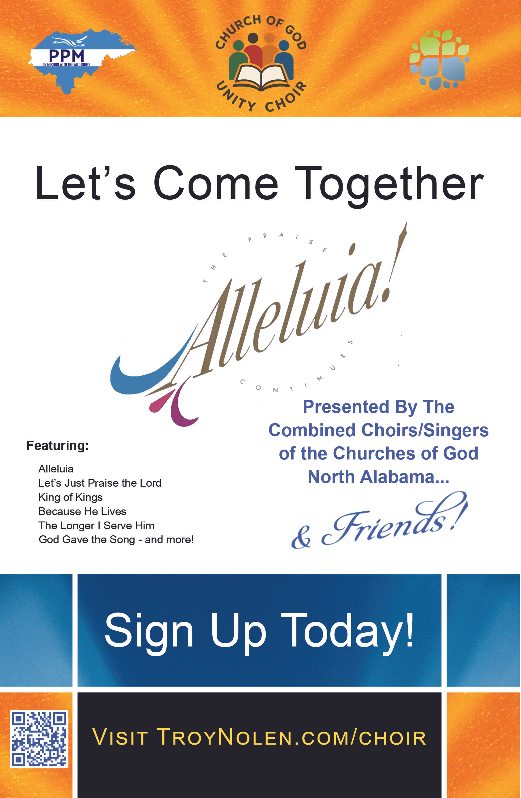 You are invited to join singers from the North Alabama and Fayetteville, TN areas to form a united choir for our upcoming performance, "Alleluia, The Praise Continues."